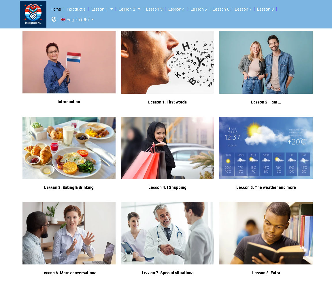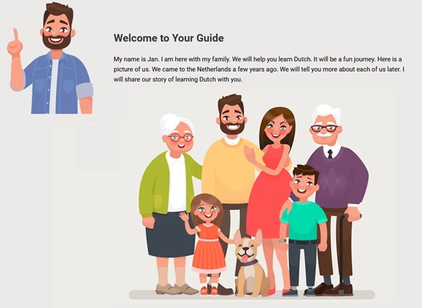 Om het extra aantrekkelijk te maken is er in de cursus ook een verhaallijn van een familie die zich hier vestigt. Hierboven zien we een afbeelding van de familie. Door de introductie van zo’n verhaallijn voorkomen we dat een cursus enkel bestaat uit een opsomming van het leren van woorden, regels (grammatica) en oefeningen. Dat aspect is ook van belang als we rekening willen houden met het zo aantrekkelijk mogelijk maken van het leermateriaal vanuit het oogpunt van zelfstudie. Alhoewel we in de introductie aangeven hoe belangrijk het is om een samen met een ander de cursus door te nemen, vaak zal de cursus toch alleen worden doorgenomen.